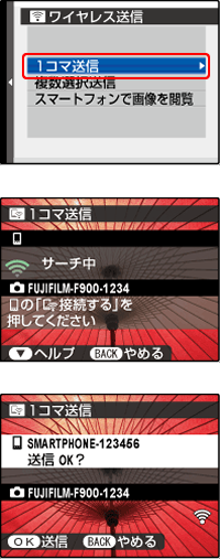 カメラのワイヤレス送信機能で、スマートフォンに画像を1コマずつ送信できます。
