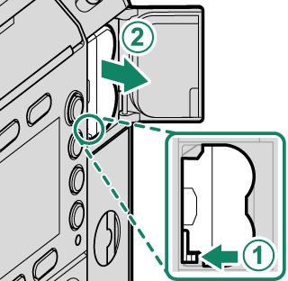 To remove the supplied battery, press the battery latch to the side with your finger to release the lock (A), and remove the supplied battery (B).