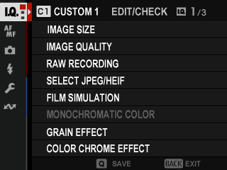 Select H[IMAGE QUALITY SETTING] > x[EDIT/SAVE CUSTOM SETTING] in the shooting menu and press [MENU/OK].