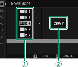 Before shooting movies, choose the frame rate and the frame size and aspect ratio.