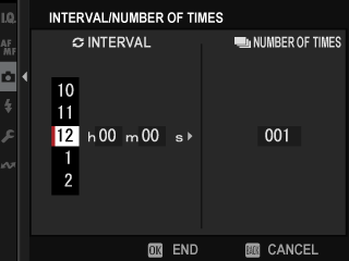 3. Use the focus stick (focus lever) to choose the interval and number of shots. Press [MENU/OK] to proceed.