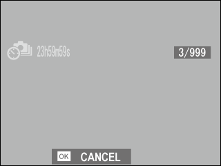 To view the pictures taken so far, press the [PLAY] button during interval-timer photography. To return to the shooting display, press the [PLAY] button again or wait until the start of the next interval.
