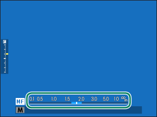 The white line indicates the distance to the subject in the focus area (in meters or feet according to the option selected for D[SCREEN SET-UP] > [FOCUS SCALE UNITS] in the setup menu), the blue bar the depth of field, or in other words the distance in front of and behind the subject that appears to be in focus.