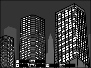 Press [MENU/OK]. The first shot will be shown superimposed on the view through the lens and you will be prompted to take the second shot.