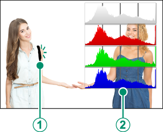 To view separate RGB histograms and a display showing areas of the frame that will be overexposed at current settings superimposed on the view through the lens, press the function button to which [HISTOGRAM] is assigned (aFunction Controls).