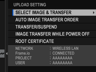 Camera has temporarily suspended upload to Frame.io. To resume, select [Frame.io Camera to Cloud] > [UPLOAD SETTING] > [TRANSFER/SUSPEND] > [TRANSFER].
