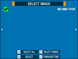 [FRAME] Protect selected pictures. Press the focus stick (focus lever) left or right to view pictures and press [MENU/OK] to select or deselect. Press [DISP/BACK] when the operation is complete.