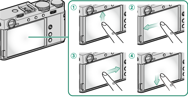 The roles played by touch-function gestures can be selected using the D[BUTTON/DIAL SETTING] > [FUNCTION (Fn) SETTING] option in the setup menu.