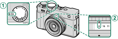 If you are using a lens with an aperture ring, rotate the ring to [A] (auto). If the lens is not equipped with an aperture ring, first select [AUTO] or [AUTO + MANUAL] for D[BUTTON/DIAL SETTING] > [APERTURE SETTING], then rotate the front command dial until the aperture value is displayed in white.