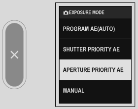 2. Use A[SHOOTING SETTING] >  x[EXPOSURE MODE] or B[MOVIE SETTING] >  F[EXPOSURE MODE] to select a shooting mode.