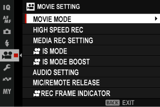 This item is also found in the movie menus (a[MOVIE MODE] (Movie Recording)). Changes here also apply to the item in the movie menus.