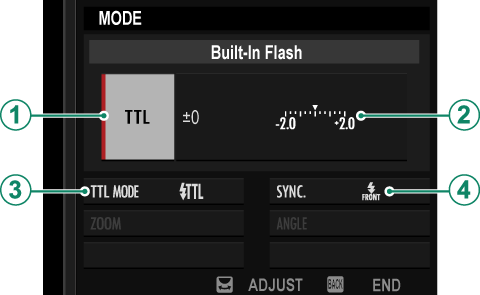 Select [FLASH FUNCTION SETTING] in the F[FLASH SETTING] menu. The camera will display options for the built-in flash.