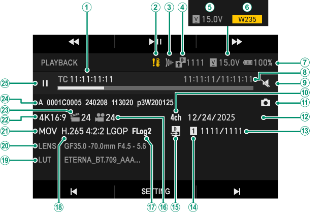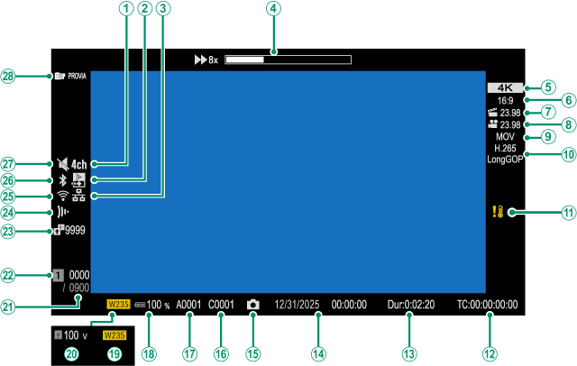 The following information is displayed on the side monitors and LCD monitor during playback.