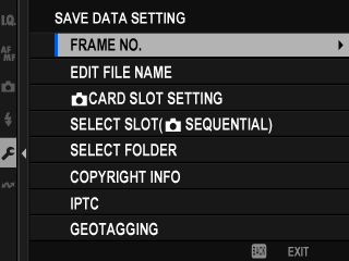 To access file management settings, press MENU/OK, select the D(SET UP) tab, and choose SAVE DATA SET-UP.