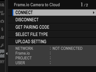 Select Frame.io Camera to Cloud > CONNECT in the network/USB settings menu.