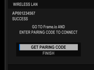 Sign in to Frame.io from a computer or other device and enter the pairing code displayed on the camera.