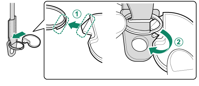 3. While holding the strap clip and the clip attaching tool, hook the clip opening in the strap eyelet (A). Remove the tool, using the other hand to keep the clip in place (B).