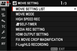 The options available for file type and compression vary with the options selected for MOVIE MODE, HIGH SPEED REC, and F-Log/HLG RECORDING.