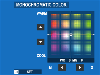 Add a reddish or bluish tinge (warm or cool color cast) to the aACROS and bMONOCHROME monochrome film simulations. Color can be adjusted on the WARM–COOL and G (Green)–M (Magenta) axes.
