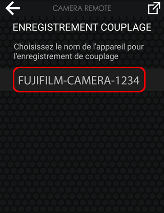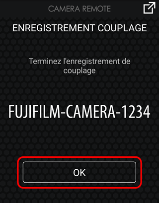 Si vous appuyez sur la touche MENU/OK alors que le smartphone affiche un message indiquant que le couplage est effectué, l'horloge et la localisation de l'appareil photo se règlent sur l'heure et sur la localisation communiquées par le smartphone ou la tablette.