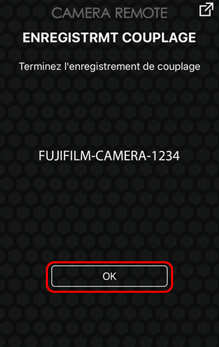 Si vous appuyez sur la touche MENU/OK alors que le smartphone affiche un message indiquant que le couplage est effectué, l'horloge et la localisation de l'appareil photo se règlent sur l'heure et sur la localisation communiquées par le smartphone ou la tablette.