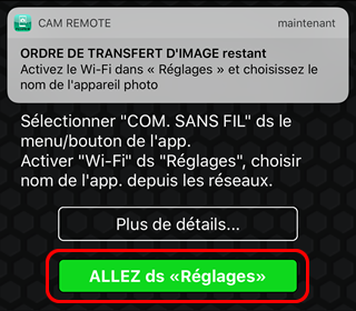 Si OUI est sélectionné pour TRANSFERT IMAGE AUTO dans les menus de l'appareil photo ou si les images de l'appareil photo ont été sélectionnées pour le transfert à l'aide de ORDRE DE TRANSFERT IMAGE, le transfert automatique sur le smartphone ou la tablette se poursuit lorsque l'appareil photo est hors tension ou en mode de lecture. Reportez-vous au manuel de l'appareil photo pour en savoir plus sur les menus de ce dernier.