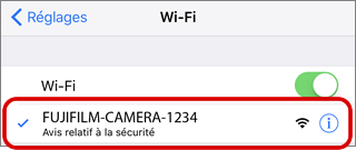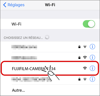 Activez le Wi-Fi sur le smartphone ou la tablette et connectez l'appareil photo comme suit :