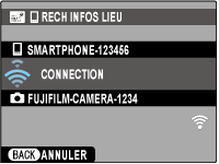 Après avoir vérifié le nom du périphérique auquel l'appareil photo est connecté, appuyez sur MENU/OK.