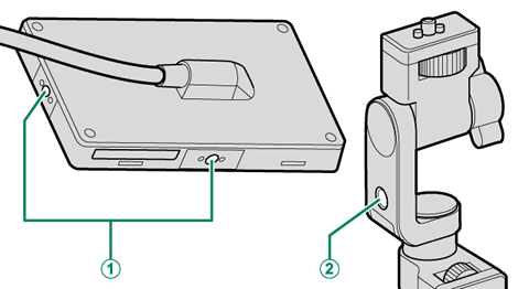 LCDモニターはカメラ本体天面やハンドルのアクセサリー取り付けネジ穴に取り付けます(aLCDモニターを取り付ける)。
