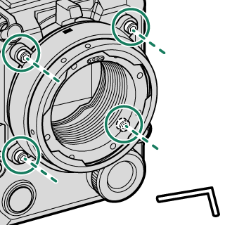 PLマウントアダプターカバーの支持枠を取り外したあと、再度PLマウントアダプターカバーに取り付けるときは、支持枠の指標とPLマウントアダプターカバーのくぼみを合わせて、付属の六角レンチ(2 mm)で締めてください。トルクレンチを使用する場合は、トルクを0.36N・mに設定してください。