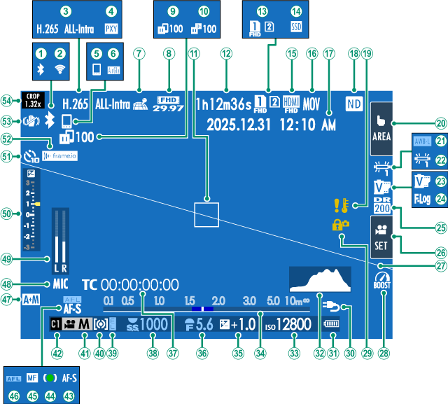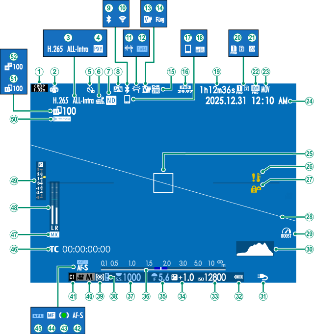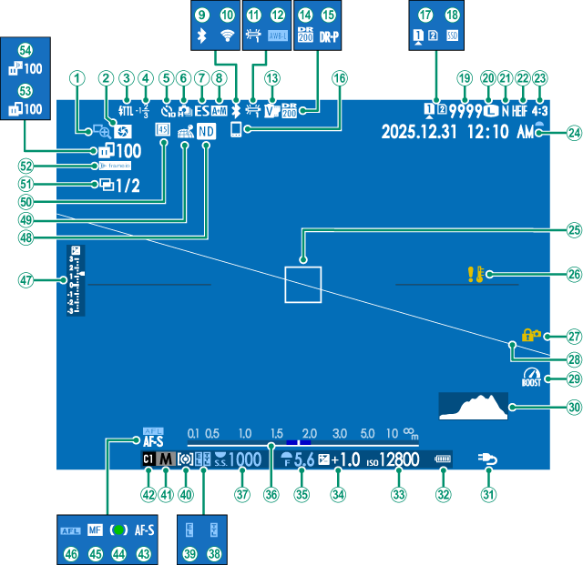 撮影時は、ファインダー(EVF)/液晶モニター(LCD)に次の情報が表示されます。