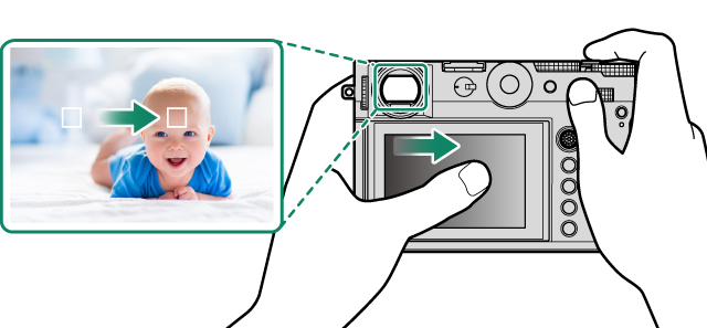 ファインダー(EVF)を使用しているときに液晶パネル(LCD)をタッチパネルとして使用して、フォーカスエリアを変更できます。D操作ボタン・ダイヤル設定 > タッチパネル設定 > EVFタッチパネル有効範囲で動作範囲を設定できます。