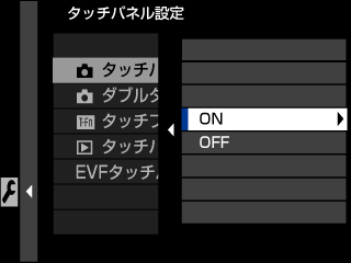 タッチパネルを使用するときは、D操作ボタン・ダイヤル設定 > タッチパネル設定 > xタッチパネル設定をONにします。