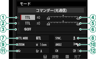 それぞれのグループの発光モードを設定します。A、Bグループは TTL/TTL%/M/Multi/OFFから選択できます。Cグループは TTL/M/Multi/OFFから選択できます。