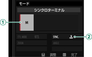 ホットシューに何も接続されていない場合やカメラに対応したクリップオンフラッシュ以外が接続されている場合は、シンクロターミナルの設定画面が表示されます。