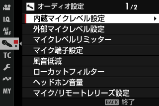 動画撮影画面でMENU/OKボタンを押して、P(オーディオ設定)タブを選びます。