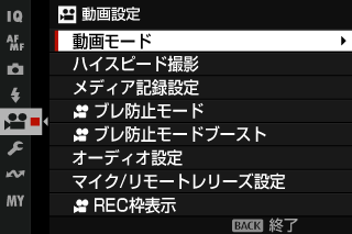 動画撮影メニューと共通のメニューです(aメディア記録設定(動画))。設定を変更すると動画撮影メニューの設定も同時に変更されます。