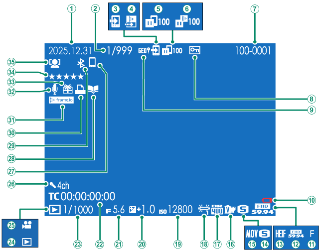 再生時は、画面(EVF/LCD)に次の情報が表示されます。
