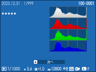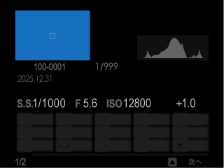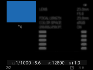 1コマ再生時にフォーカスレバーを上に動かすと撮影時の情報を確認できます。