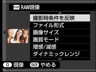 RAW画像の再生時にQボタンを押しても、RAW現像を表示できます。