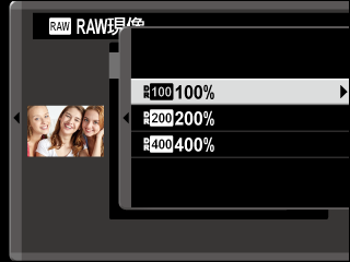 撮影したRAWファイルを、パーソナルコンピューターを使用せずにカメラでさまざまな設定を加えて別ファイルで保存(現像)できます。