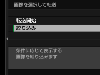 画像選択画面でDISP/BACKボタンを押してから絞り込みを選ぶと、表示する画像の絞り込みができます。