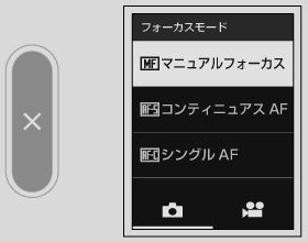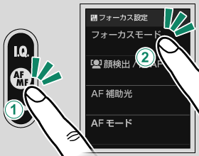 2. サブ液晶モニターでGフォーカス設定をタップし(A)、フォーカスモードをタップします(B)。