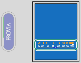 フォーカスリングを操作すると距離指標が表示されます。白い線はピントの中心値を、青いバーは被写界深度を示します。