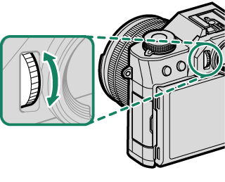 ファインダー内の表示が見えにくいときは、ファインダーをのぞきながら視度調節ダイヤルを回し、ファインダーの表示がもっともはっきり見えるように調節してください。