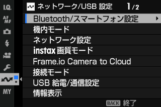 撮影画面または再生画面でMENU/OKボタンを押し、I(ネットワーク/USB設定)タブを選びます。