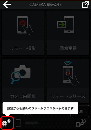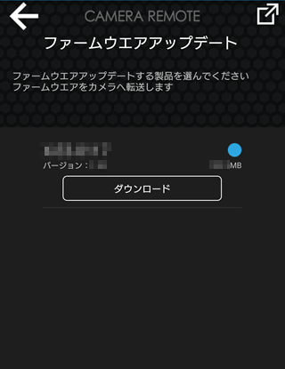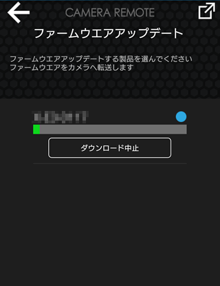 ダウンロードしたファームウエアデータを、スマートフォンからカメラに転送します。