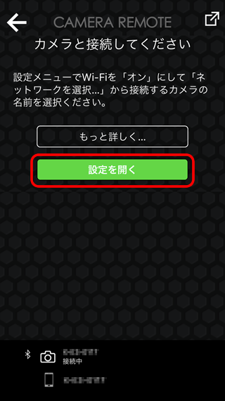 iOSの場合はカメラとの接続を促す画面が表示されます。設定を開くをタッチして、接続するカメラを選択してください。Androidの場合、この操作は不要です。