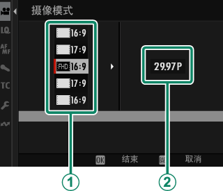 按下对焦棒(对焦杆)上方或下方高亮显示一个画面速率(B)并按下 MENU/OK。