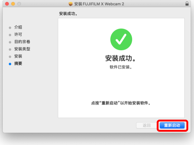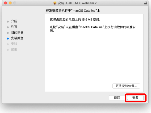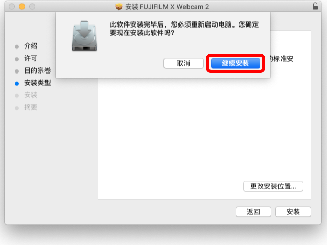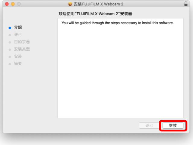 在安装 FUJIFILM X Webcam 时需要 Mac 的管理员权限。